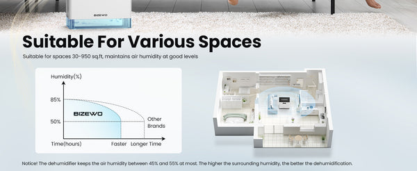 - [Smart Home Dehumidifier] BIZEWO dehumidifiers use semiconductor condensing technology to efficiently remove humidity from the air while ensuring quietness, keeping humidity levels below 45%, Suitable for room, basement, bedroom, bathroom, closet, office, garage, kitchen, laundry room, storage room. Create a healthy and comfortable environment for your family.