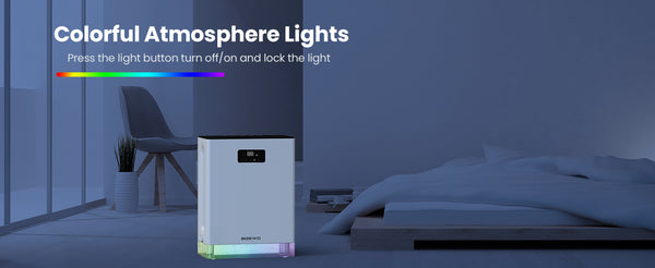 - [Colorful Night Lights] The dehumidifier for the bedroom has seven gradient ambient lights, when you like a certain color, just wait for the light to change to that color automatically, then press the light button to lock it in. You can also use it as a night light to create a sweet and romantic sleeping atmosphere for you. If you don't like the light, you can also choose to turn it off.