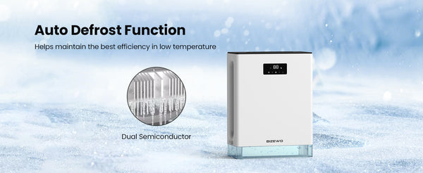 - [Auto Defrost] The portable bathroom dehumidifier is equipped with an intelligent defrost function that starts automatically defrosting when the temperature drops below 35°F, melting the frozen water to maintain constant and efficient dehumidification.