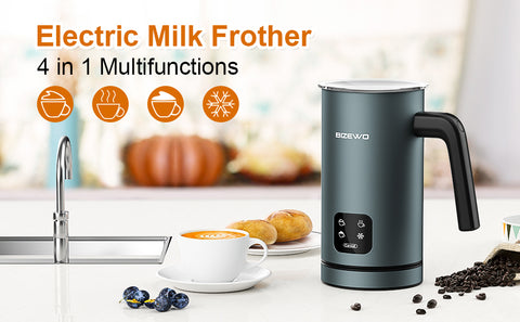 - ☕4 in-1 Coffee Frother: BIZEWO electric milk frother has four functions, namely hot dense foam, heating milk, hot airy foam, and cold milk froth, which can meet your multiple needs at the same time. All year round you can DIY coffee drinks at home and enjoy a different experience. With an LED touchscreen panel, the buttons are sensitive and easy to operate. The milk frother will beep when the production is complete to indicate that you have finished making